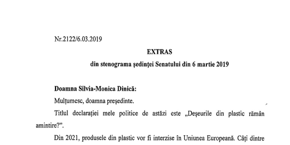 Domnule președinte de ședință, Doamnelor și domnilor senatori, Stimați colegi, Titlul declarației mele politice de astăzi este ,,Deșeurile din plastic – rămân amintire?”. Din 2021, produsele din plastic vor fi interzise în Uniunea Europeană. Câți dintre noi sunt conștienți de…