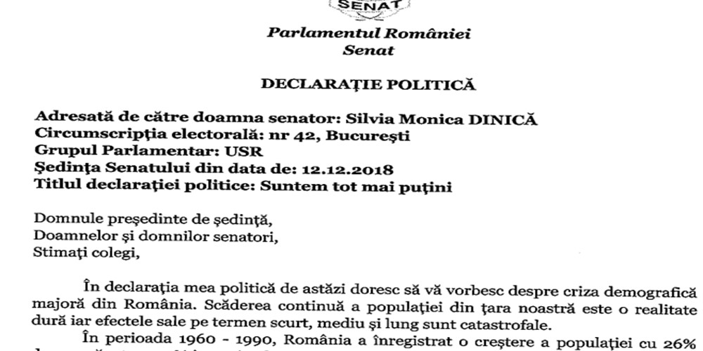 Domnule președinte de ședință, Doamnelor și domnilor senatori, Stimați colegi, În declarația mea politică de astăzi doresc să vă vorbesc despre criza demografică majoră din România. Scăderea continuă a populației din țara noastră este o realitate dură iar efectele sale…